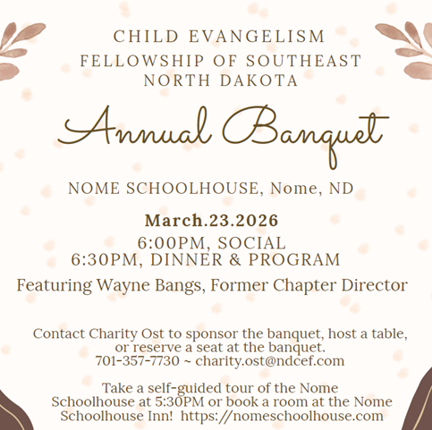 We are looking forward to our Annual Banquet on March 23, 2026 at the Nome Schoolhouse in Nome, ND. This is a great time to gather with both new supporters and longtime faithful supporters to celebrate God's work in the lives of children to whom we minister.